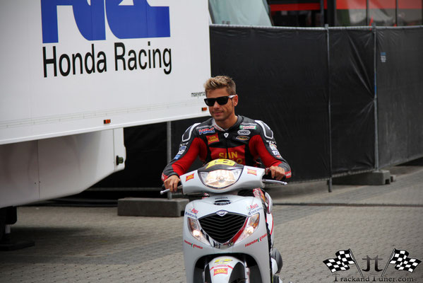 All the riders ride from their motor homes on scooters to the pit. We now know why Ben Spies has been nicknamed Ben “Elbow” Spies.